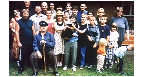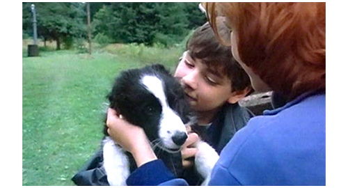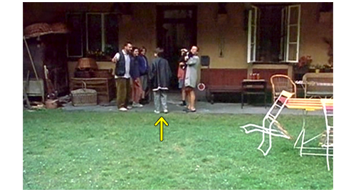 エリックは、クラクションを何度も鳴らしながら家に近づいて行き、それを聞いたフィリップ、イトカ、ブランカが家から走って出て来る。そして、停まった車の前に立つと、じっとエリックの顔を見る。エリックが笑顔で頷くと、フィリップは両手を上げて 「やった!」と叫ぶ。車から出たリボルの頬にブランカが心を込めてキスする(1枚目の写真)。イトカがリボル用に持って来た櫛で、彼の頭毛を梳かしていると、マルセラがボーダーコリーを抱いて来て、「この子に、どんな名って訊いたら、パンって言ったわ」と言ってリボルに贈る(2枚目の写真)〔プラハの冷淡な伯父伯母と違い、何と親切な家族なのだろう〕。ここでエリックが、「休日のご馳走はどこだい?」と訊き、みんなは玄関に向かって走って行く。まだうまく歩けないリボルが犬を抱いたままゆっくり玄関に歩いて行くと、玄関の両脇に3人と2人が並んで立ち、リボルを迎え入れる(3枚目の写真、矢印)。食事のシーンはないが、そのあと、干し草置き場の中で、リボルのピアノに合わせて、みんなが楽しそうに歌う(4枚目の写真、矢印)。