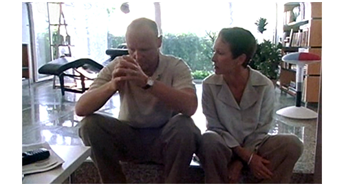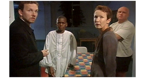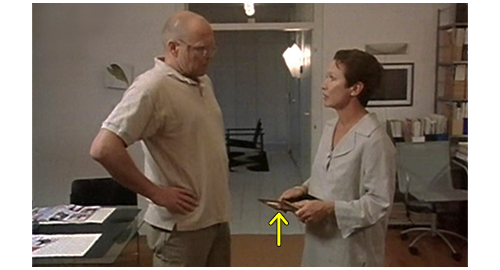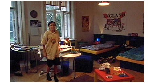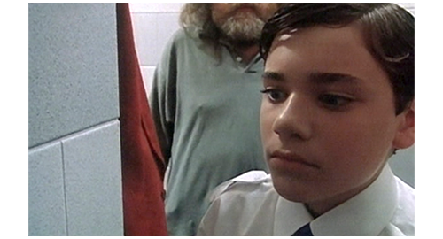 リボルは、田舎の一軒家に連れて行かれ、汚い部屋に入れられ、ドアの入口に重い棚が置かれ、逃走できないようにされる(1枚目の写真、矢印)。それにもかかわらず、部屋の中では右手の手錠がかけられ、動くこともままならない(2枚目の写真、矢印)。一方、伯母はリボルの学校に行き、「最近、リボルの様子が少し変だと感じたことはありますか?」と、同じ部屋だった生徒2人に質問する。「彼、時々、物を売ってたよ」。「どんな物?」。「ナイフを売ってくれたんだ。クリストフは、コンピュータ・ゲームを買ってた」。「お金が要るって言ってたの?」。「うん」。ここで、教師が、「何のためだか知ってるか? リボルが、家を出てこうと思ってるってサジェストしたことあるか?」〔伯母が、最初から “家出” を前提に質問に来たので、相手の思考も捩じられてしまっている〕。その時、金曜にリボルが学校を出て行く時に、「もしかしたら、戻らないかも!」と冗談を言ったのを聞いた方の生徒が、「金曜に帰って行く時、彼、戻らないかもしれないって言ってた」(3枚目の写真)と発言する。それを聞いた最初の生徒が、「彼、伯母と伯父は、自分のためにぜんぜん時間を割いてくれないって言ってた。いつも仕事ばかりだって」と、事実を述べる。しかし、伯母は、自分に都合の悪い話は無視し、教師に、リボルが学校でどんなだったかを尋ねる。教師は、「彼は問題を抱えていたと思います」と答える〔何れにせよ、伯母が、リボルが “家出” したという思い込みに対し、それが自分の落ち度のせいだと認めることを拒否し、あくまでリボルが “悪い” と決めつけようとしていたことが後で判明する〕。