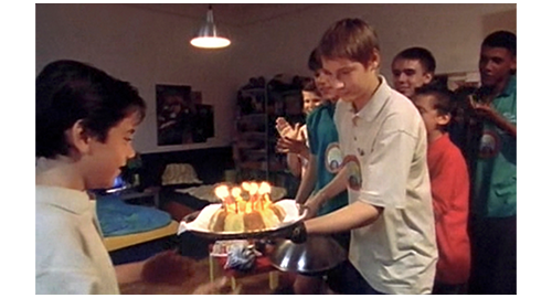 金曜日、リボルが寮の部屋で何かしていると、「♪スーツケースにはお金がいっぱい。リボル、リボル、最高だ」という歌声とともに両開きのドアが開き、10人ほどの生徒が入って来る(1枚目の写真)。「♪リボル、リボル、これ何だと思う? 誕生日のケーキ、持ってきた」。そして、ロウソクが一杯立ったケーキを見せる(2枚目の写真)。「これ僕に?」。「他に、誕生日の奴いるか?」。「ロウソク、吹き消せよ」。「一気だぞ」。リボルが、一度に全部吹き消すと、みんなが拍手する。リボルは、笑顔で 「みんなも食べて」と言うが(3枚目の写真)、一番にケーキを手に取ってかぶりつく。しかし、噛むにつれて顔が変わり、「どうしたんだ、不味いのか?」の声がかかった直後に、手で口を押える。すると、こんどは皆が笑い出す〔学食での捨て台詞を誰かが聞いていた〕。その声を聞いて入って来た先日の講師が 「何事だ?」と訊くと、トイレに行こうと、手で口を押えたリボルが部屋から出ようとして向かって来る。事情が分からない講師は、リボルを出させない。そこで、我慢できなくなったリボルは、カリフラワーを砕いて作ったケーキを講師に向かって吐き出す(4枚目の写真)。リボルは部屋から走って出て行き、講師は残った生徒達を睨みつける。