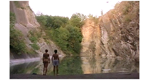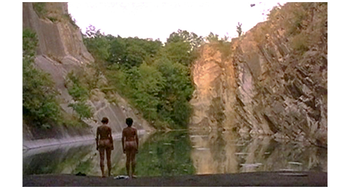 4番目のシーンでは、まず、マルセラの顔が映る。そして、彼女は、意を決したように、着ていたシャツを脱ぐ(1枚目の写真)。それを横目でびっくりして見ているリボルの顔が映ると(2枚目の写真)、次は、池の前に立っている2人の後ろ姿が映る。マルセラは全裸で、リボルはパンツだけ(3枚目の写真)。リボルも意を決してパンツを脱ぎ、2人は全裸で並ぶ(4枚目の写真)。そして、一緒に池の中に入って行く〔マルセラは、犬をあげたり、レッドカラントでキスしたり、こんなきわどい行動までするので、リボルが好きに違いない〕。