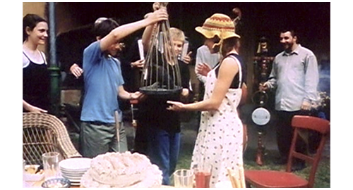 5番目のシーンは、リボルとフィリップが、それぞれ馬に乗って森の中に入って行き、馬を木に繋ぐと、焚き火の近くで横になり、何か分からないものを棒に刺して火で焼いている。6番目は、円盤状の木の板に、リボルが昔覚えた要領で、電動ドライバーを使って、等間隔に穴を開けている(1枚目の写真)。7番目はマルセラの誕生日。イトカとフィリップが買ったコクマルガラスを、リボルが作った木製の鳥籠に入れて、マルセラにプレゼントする(2枚目の写真)。マルセラとリボルは仲良く踊り(3枚目の写真)、誕生日パーティの最後に、地元のオーケストラと一種に記念写真を撮る(4枚目の写真)。