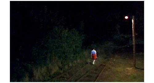 家中が寝静まった頃、パジャマから服に着替えてベッドで横になっていたリボルは、起き上がると、ベッドの下に置いておいた旧式の懐中電灯を点け、ベッドの下に入れてあったグスタの日記の中から1枚の紙〔家を出て行く事情を書き綴った紙〕を取り出す。そして紙を半分に折り畳むと、靴と一緒に手に持ってフィリップの横に行く。そこで、紙を台の上に置くと、その上に革ベルトを載せ、懐中電灯と靴だけを持って(1枚目の写真、矢印は紙とベルト)、階段を下りて行く。家から出る前に、パンの頭を撫でる(2枚目の写真、矢印)。家から出たリボルは、靴を履き、他には何も持たずに線路まで静かに行くと、線路の上をスカルスコ駅に向かって歩き始める(3枚目の写真)。