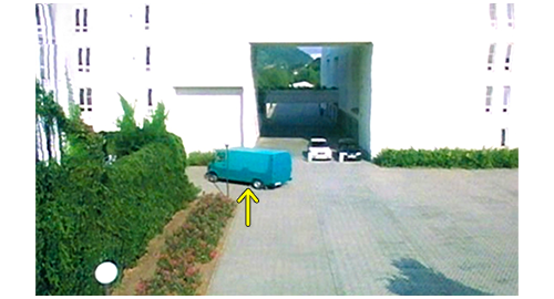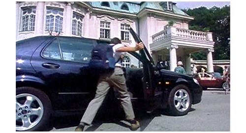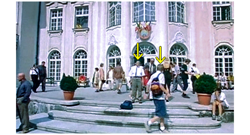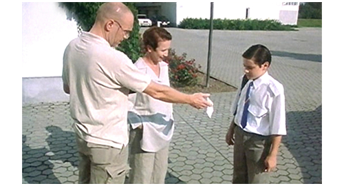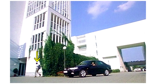 お昼過ぎ、リボルは迎えの車に乗ろうと 学校の玄関から外に出る。すると、背の高い友人が 「おい、日曜にはちゃんと時間通り戻ってこいよ。体育館の準備がある。僕一人で全部運ぶなんてうんざりだ」と声をかける。それに対し、リボルは 「もしかしたら、戻らないかも!」と冗談を言うが(1枚目の写真、左の矢印がリボル、右の矢印が友人)、この発言があとで問題に。リボルは、必ず週末も学校にいるので、教師の1人が 「やあ、どこに行くんだい?」と声をかける。「初めて週末に家に帰るんです。僕の誕生日を祝うため」。教師は、自転車で階段を下りながら〔あまり裕福そうには見えない〕、「お祝いか、すごいな」と言い、「ありがとう、先生」と感謝される。そこに、スウェーデン製のサーブ9-5セダンが乗り付け、リボルは走って助手席まで行き、乗り込みながら、「今日は、マデラさん」と運転手に言い(2枚目の写真)、マデラは 「やあ、リボル」と気安く返事する。車は、一旦都心を通り、郊外の高級マンションへと向かう。リボルが車を降りて玄関に歩いて行くと(3枚目の写真、矢印)、サーブを追ってきた旧式の青色バン(1980年代のメルセデス)が、離れた場所にこっそりと駐車する。