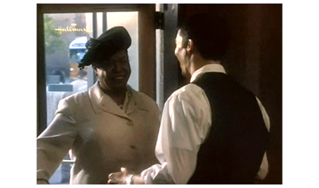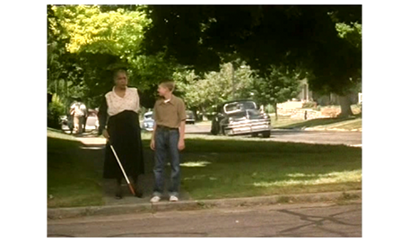 翌朝、スコットは、母に言われて髪を固め、Yシャツにネクタイ姿になると、テストを受ける前に アーニャに会いに行く。アーニャは、テストの日の朝にスコットが現われたので〔彼女には、ネクタイ姿は見えない〕、不審そうに、「テストを受けないの?」と訊く。「幸運を祈って欲しくて」。それを聞いたアーニャは笑顔になり(1枚目の写真)、「そうかい、幸運を。お前さんを誇りに思うよ」と言う。スコット:「言いたいことがあるんだけど」。アーニャ:「これまでだって、言ってきたろ」。「これまでずっと、ママと僕だけだった。でも、あなたは家族と同じだ。僕のお祖母ちゃんだ」(2枚目の写真)。その言葉を聞いて心打たれたアーニャは、スコットを抱きしめる。交差点を渡り終えた時に抱き締めた時とは違う意味の、スコットの心からの思慕に、アーニャは、「ありがとよ、坊や。感激だわ〔I'm so honored〕と喜ぶ(3枚目の写真)〔この映画の時代(1949年)、まだ、黒人は白人と同じ学校に通うことすら許されていなかった。最高裁が初めて違憲判断を示したのは、ようやく1952年になってから(Briggs対Elliot事件)。だから、この抱擁は信じ難いほど素晴らしい〕(https://www.loc.gov/)。アーニャは、さらに、「お前さんのお祖父ちゃんやお祖母ちゃんは、何を失ったかが分かってない。もし、お前さんを一目見れば、ばかげたことなんか すぐに終わるのに」と、とても重要なことを言う。スコットは、最後に、「忘れないで。明日は、パトリックの事務所に行く、大事な日だよ」と言って、別れる。