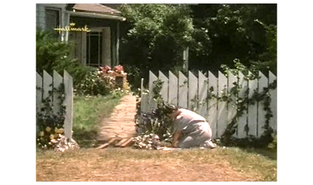 トラックは、翌朝、ガーフィールドに着く。運転手はスコットを降ろすと(1枚目の写真)、「郵便局で訊けば教えてくれる」とアドバイスした後、「ママに電話しろよ」と言う。親切な運転手だ。そして、1軒の家が映る。家の前の柵の前で 一人の老婦人が膝をついて何か作業をしている(2枚目の写真)。スコットが近づいて行くと、足音で女性が振り向く。「何かご用?」。「ライムズさんですか?」。「そうよ、あなたは?」。「スコット・ライムズ。あなたの孫です」。それを聞いた祖母は、両手を広げて孫を抱きしめる(3・4枚目の写真)。