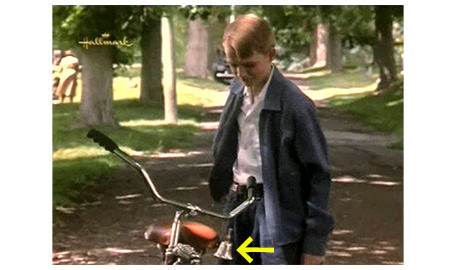 それからどのくらいの時間が流れたのかは分からない。スコットが、念願の新しい自転車を磨いている〔薬局のアルバイト代で購入した〕。そこに、母が ライラックの花束を持って出てくると、「夕食までには戻るのよ、特別なもの作るから」と言って花束を渡す。スコットは、「今日もパトリックが来るの?」と訊く。「どうしたの? 彼、嫌い?」。「いい人だと思うよ」。「私も」〔パトリックは独身〕。スコットは、自転車で墓地まで行くと、アーニャの墓碑に向かって、「知っておいて… 僕が生きている限り、アーニャのたくさんのベルは、あなたのことを僕に歌ってくれるんだ」と笑顔で言うと(1枚目の写真)、花束を墓碑の横に置く(2枚目の写真)。そして、「紫だよ、アーニャ。今なら、見えるよね」と言い、立ち上がって自転車に戻る。ポケットから、アーニャと点字で書かれたベルを取り出すと、自転車のハンドルにぶら下げる(3枚目の写真、矢印)。スコットは、「じゃあ、飛ぶよ」と言い、自転車で走り始める。