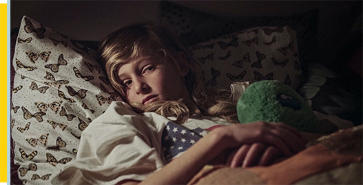 その日の夜、両親は、屋外での食事の後片付けをしている。ジョーは居間に行くと服を脱いで下着だけになる(1枚目の写真)。両親は、キッチンでキスし合っている。ジョーは、余ったクッキーを取りに来て、サリーからは 「1つだけよ」と言われ、トロイからは 「おい、パジャマを着ろよ。寝る時間だぞ」と言われる。トロイは、ゴミ出しをした後、ジョーの様子を見に部屋に行く。ジョーがあんまり不機嫌な顔をしているので、「待てよ、悲しい顔コンテストで優勝する気だな?」とおどけてみせ、「どうやるか、教えてくれよ」。この言葉でジョーも笑顔になる。しばらくしてサリーが様子を見に行くと、トロイがジョーの横に寝て、「2人のカウボーイがいて、火の周りに座ってココアを飲んでる。2人とも、一日中炎天下で金を探してて、くたびれ果てたんだ。2人が見上げると、空には流れ星が…」と話す。すると、ジョーがそれを受けて、「そしたら、2人のうちの1人が、メールを受け取ったの。あれは、流れ星じゃなくって、UFOだって」(2枚目の写真)。サリーは、ジョーを1人で眠らせようとするが、ジョーは 「眠るまで一緒にいてくれる?」とトロイに甘える。サリーは、仕方なくその場を去るが、ジョーが母より父の方が好きなことがよく分かる。