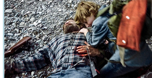 一方、森の中の2人。馬に乗っていると、トロイが、「おしっこに行く。お前さんも行くか?」と言い出す。「ううん」。トロイは馬を降りると、ジョーに馬を任せて そそくさと消える。ジョーは、馬のロープを木に巻き付けると リュックを地面に置くが、枝の折れる音にハッとする。続いて、何かが動くカサカサという音も聞こえる。トロイから、カナダの熊のことを聞かされていたジョーは、心配になり、ライフルを取り出し、引き金に指を置いて構える。そして、次に音がした方に銃口を向けて発砲する(1枚目の写真)。ジョーにとって恐ろしいことに、それは熊ではなくて人間で、草むらの中に傷を負って仰向けに倒れていた。発砲音にびっくりしたトロイが駆け付け、男が持っていたトランシーバーを取り上げ(2枚目の写真、矢印)、自分のスボンのベルトを引き抜くと、弾の入った左脚上部を縛って止血する。ジョーは 茫然としてそれを見ている(3枚目の写真)。トロイは、トランシーバーに向かって、「メーデー、撃たれた」と叫ぶと、ジョーを連れて渓流まで行き、血に染まった両手を洗うが、ジョーの茫然自失状態は変わらない。