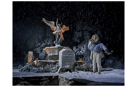 ブライアンがいたのは、大好きだった父の墓。雪の中で、じっと父の墓標を見上げている(1枚目の写真)〔吐く息がちゃんと白い〕。墓地の管理人は、中にブライアンがいることに気付かないまま、ゲートを閉めてしまう。それに気付いたブライアンは、ゲートまで走って行くが、「待って!」と叫んでも 車は去ってしまった(2枚目の写真)。その頃、キャロルは、自宅の居間で、ブライアンがクレパスで描いたトマスの墓碑の天使を見て、ここに行ったに違いないとピンと来る。一方、墓地では、墓標にもたれて半ば雪に埋もれていたブライアンにフルークが寄って行き、ぴったりとくっつき体温の低下を防ぐ(3枚目の写真)。