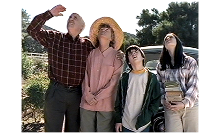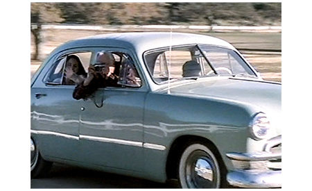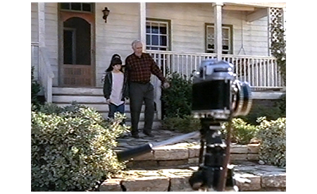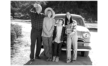 家の外には、三脚の上にカメラが載っていて、家の中からは祖父とジャーニーの争う声が聞こえる。「なんで、やってみない?」。「できないよ」。「何を、そんなにゴチャゴチャ言っとる。この件については、2人で話し合ってきたじゃないか」。「やり方も知らないのに、町まで運転なんてできないよ」(1枚目の写真)。祖父は、ジャーニーの初運転記念の写真をタイマーで撮ろうと、三脚を立て、車の前に4人で並ぶ〔車は、1950年製のフォード・カスタム・セダン〕。タイマーをセットし、10から7まで来た時、上空を軽飛行機が飛ぶ音が聞こえ、全員が空を見上げてしまう(2枚目の写真)。出来上がった写真(3枚目の写真)も、全員が空を見ている。「気にするな。出かけるとするか。現像に持ってくフィルムが 何本もあるし、仕上がった写真も取って来ないと。行くぞ、ジャーニー」。