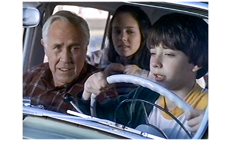 運転席に乗ったジャーニー。「ペダルに足が届かないよ。前だって見えないし」。「じゃあ、この枕の上に座ったらいい」。「待って、ブレーキが…」。「さぁ、頑張れよ」。車は何とか前に進み始める。しばらく走り、祖父が、「いいぞ。上手いじゃないか」と褒める(1枚目の写真)。「やったよ。だけど、なぜこんな車が好きなの?」。「わしの お気に入りさ。思い出が詰まっとるんだ」。これに、キャットが口を挟む。「絶滅種よ〔車のこと〕。お祖母ちゃんは 『リョコウバト』〔1914年に絶滅〕だと言ってた」。「何だと、そんな事を?」。祖父は、助手席から身を乗り出してカメラを構える。「フラついとるぞ。真っ直ぐ運転しろ」。「また、写真なの? 僕が、事故ったら、それも、写真の題材にするつもりなんだ」。祖父は、途中、道路脇で野菜の販売所を作っている顔見知りの女性に声をかけ、写真をパチリ(2枚目の写真)。トラクターに乗った男性もパチリ。最後は、対面で自転車に乗ってやってきたクーパー。こっちは、ジャーニーも いい所を見せたいので、祖父に写真を撮るよう要求する。撮ったのは、びっくりしているクーパー。これで、ジャーニーも笑顔になる。そして、「さっきの、飛行機を見上げてた写真… 絶対、いい出来だよ」と祖父に言う(3枚目の写真)。「わしも そう思うな、ジャーニー」。キャットは、嬉しそうに、「“似た者 同士” ね」と以前の言葉をくり返す。