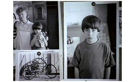 朝食が終わり、全員が外に出た時、電話がかかって来る。一番用事のなかったジャーニーが電話機まで走ると、それはミンだった。電話を取った時の笑顔が消える。最初は、母の応答に応えようとしなかったジャーニーだが、「ジャーニー、あなたなんでしょ?」と何度も促され、ようやく、「そうだよ」と言う。母:「変わりない?」。「ママ、猫が来たの。その猫、とってもいい お母さんなの。僕と一緒に、いてくれる。いつまでもね」(1枚目の写真)。電話のシーンはここで終わり、そのあと、ジャーニーは納屋に行って壁の写真をじっと見る(2枚目の写真)。そこに祖父が来たので、「電話、ママからだった」と報告する。「『変わりない』って訊いてくれたけど、家を出てったこと、一言も謝ってくれなかった」(3枚目の写真)。「そうだな、ミンは、自分が悪いとは認めんだろう」。「ママは、こうも言ってた。『たかが写真じゃない』って」。「お前のママには、写真の事が、ぜんぜん理解できんのだ」。「ママは、僕に 『訪ねて来て欲しい』って言ったけど、僕は、出来ないって答えた。ママには、こうも言ったんだよ。お金なんかじゃなく、手紙を送ってくれれば。いつの日か会ってもいいって… 多分だけど」。ジャーニーの話はさらに続く。「お祖父ちゃん?」。「何だね、ジャーニー?」。「僕、ママに言ったんだ。“完璧” な物は何もないって。物事は “ほどほど” がいいんだって」。
