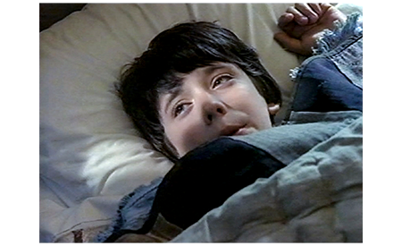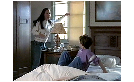 これだけ言うと、祖父は離れて行こうとしたが、ジャーニーが引き留める。「お祖父ちゃん? どう思う? ママが出てったのは、僕が、“ほどほど” じゃなかったから?」。「違う。わしは、お前が聞きたくない時も “真実〔truth〕” を話してきたろ?」。「“時々〔sometimes〕” だよ。だって、ママは戻って来ないって、言ったじゃない。ママは絶対戻って来るから、“真実” じゃない」。「一番大事な “真実” は、お前には、何の “落ち度〔fault〕” もないという事だ」。「ママにも “落ち度” はないよ」。そして、「写真は どこにあるの?」と訊く。「僕、写真が見たい」。「どの写真だ?」。「パパとママと僕の写真… キャットのも。僕たちが、エメットみたいに幼かった頃の写真。僕が、パパの膝に乗っていて、歌ってもらってた時の写真」。「なくなってしまった」。「“なくなった〔gone〕” って、ママが持ってったの?」、「“真実” が…?」。「知りたい」。「ママが引き裂いた」。その強烈な言葉に、ジャーニーは凍り付き、それを教えた祖父を恨む(1枚目の写真)。そして、何も言わずに立ち去る。ジャーニーは、そのまま自分の部屋に直行し、病気だと称して朝になっても起きない。そこに入って来たキャットは、「あんたが病気だなんて信じない。もし、病気だとしても、楽しんでるんでしょ」とズバリ指摘。「ノドが痛いんだ」。「見せなさいよ」。「熱だってあるんだ」。キャットは、ジャーニーが毛布3枚、キルト、ベッドカバーを被っているのを確かめると、「ジャーニー、毛布が5枚よ、孵化してチョウチョになっちゃうわ、夏なのに」と言う。「キャット、ママが、写真を引き裂いたんだ」(2枚目の写真)。キャットは、ジャーニーの毛布類をすべて剥ぎ取ると、「ジャーニー、あんたは病気じゃない! 逃げてるだけよ」と言い、カーテンを上げ(3枚目の写真)、「逃げて、ウジウジしてるだけ!」と、窓を開け放つ。