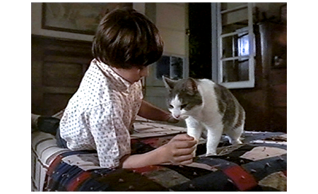 その日の夜、ジャーニーが窓のところを見ると、暑くて開けっ放しの窓の桟の上に例の猫が座っている。ジャーニーの笑顔を見て、猫は部屋の中に入ると、ジャーニーが寝転んでいるベッドの上に上がる。ジャーニーは、猫を優しく撫でる(1枚目の写真)。ジャーニーは、思い立つと、部屋を出てキッチンに行く。そこでは、祖母が日中の後片付けをしていて、ジャーニーに 「何か して欲しい事ある?」と尋ねる。「何も。お祖母ちゃん。お休みなさい」。しかし、ジャーニーの目的は祖母ではない。「お休み」と言ってソファから振り向いた祖父に向かって、ジャーニーは、手で合図して部屋に来るように頼む(2枚目の写真)。祖父を部屋に入れると、ジャーニーはすぐに猫を指差す。「おやまぁ、これは」と言って 優しく猫を撫でた祖父は、「誰の猫なんだ?」と訊く。ジャーニーが答えないので、ピンときた祖父は、「ダメだぞ、ジャーニー。お祖母ちゃんが猫嫌いだって事、知っとるだろ? 何せ、鳥好きだからな」と注意する。しかし、ジャーニーは、「僕、この猫 好きだよ。窓から入って来た。だから、僕のさ」と主張する(3枚目の写真)。「名前を付けるんじゃないぞ。ウチのルールは知っとるじゃろ… もし 名前を付けたら、ずっと面倒を見ないといかん」。そのあと、祖父は、猫の足から血が出ているのに気付く。そして、「お前は大した猫ちゃんだ〔You are really something〕」と言いながら、可愛がる。