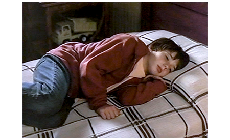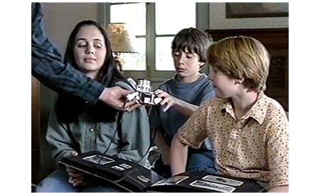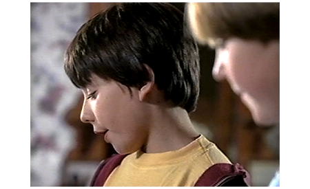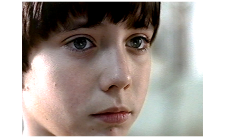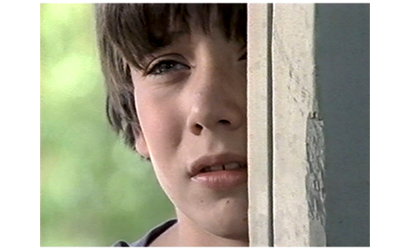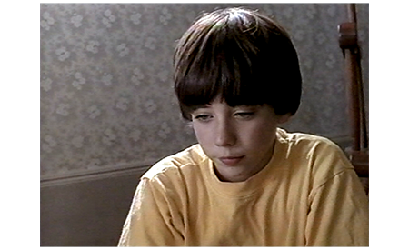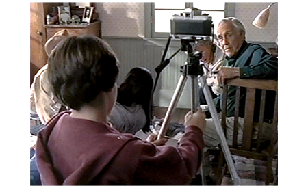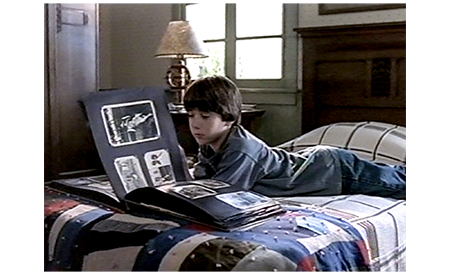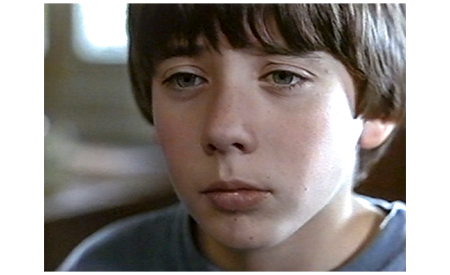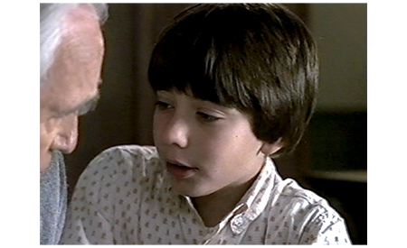 しばらくすると、姉のキャットが入ってきて、アルバムを見始める。すると、近所に住むクーパーという少年が窓から入ってくる。キャットは、「他のみんなのように、ドアから入って来れないの?」と言うが、答えは、「No」。しかし、いつもと違うのは、幼児を連れてき来たこと。キャットは、幼児をみて大喜び。それを見たクーパーは、「結婚してくれる?」と訊く。それを聞いたジャーニーは、姉に 「聞き飽きたんじゃない?」と訊くが、返事は 「何度でも聞きたいわ」。クーパー:「いいコンビだもん。ママも、そう言ってる」。クーパーは、ミンのことを念頭に、「それで?」と訊く。「出てったわ」。しかし、話題を変えたいキャットは、クーパーの家族はみんな顔が似ていると言う。クーパーの表現が面白い。「家族の写真を 空に放り投げたとするだろ。そしたら、全部、僕の写真に見えちゃうんだ」。それを聞いたジャーニーは、「でも、僕は、誰とも似てたくないな」と主張する。そこに入って来たのが祖父。祖父は、「持っててくれ、ジャーニー」と言ってカメラを渡すと(1枚目の写真)、幼児を膝に乗せる。それを見たジャーニーは、カメラを構えて撮り、「ごめんなさい。撮るつもりなんて…」と謝る。祖父は、「いやいや、構わんぞ。好きなだけ、一杯 撮るがいい」と言いながら、「♪パカパカ、ボストンへ…」と幼児をあやす。その響きが聞き覚えあるように思え、ジャーニーは一体何だろうという顔をする(2枚目の写真)。この、目の “上まぶた” を少し吊り上げる表情はマックス・ポメランク独特のもので、『ボビー・フィッシャーを探して』の最終決戦の場で、詰め手を理解しかけ “ホントかな” という時に見せる表情(3枚目の写真)と全く同じだ〔DVDの画質の方が、VHSの画質より悪い!〕。そして、独白。「僕たちは庭にいた。僕は、持ち上げられたり下げられたり。でも目は、青いシャツの白いボタンに吸い寄せられた。辺りには、夏の匂いが満ち溢れていた。声が聴こえる… 大きくなったり、小さくなったり、笑ったり。『見てごらん、坊や』。シャツのボタンが見える。首元まで。でも、顔がないのだ。僕のパパだと、分かっているのに、顔がない」。幼児を床に戻し、カメラを受け取ろうとする祖父に向かって、ジャーニーは、「カメラを通すと、物事は違って見えるんだね。ほんとの姿とは、違ったものになるんだ」と言う(4枚目の写真)。「時にはな。だが 時には、写真が “ありのまま〔what is really there〕” を見せる事もある」。「どうやったら、それができるの?」。「わしには 分からんよ、ジャーニー。多分、だから、みんなも写真を撮るんだろう。それが 何なのかを見るために」。「どういう 意味なの… “それが 何なのかを見るため〔to see what is there〕” って?」。祖父は、アルバムに貼ってある自分の子供時代の写真を指差して、「見なさい」と言い、部屋から立ち去る。ジャーニー:「何が言いたいんだろう?」。クーパー:「これって、君じゃないのかい?」。キャット:「お祖父ちゃんよ、ジャーニー。“似た者 同士〔Two of a kind〕” ね」〔含蓄のある言葉〕。
