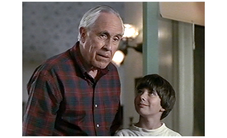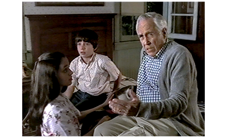 ドアが突然開き、祖母が入って来て、「そこで、何やってるの?」と訊く。そして、猫を見つけると、「マーカス、事もあろうに〔for heaven's sake〕!」。その大きな声を聞いてキャットが入って来て、「もう 名前は付けたの?」と訊く。祖父は、「ロティ、これは 怪我した動物なんだ。“思いやり〔humane〕” を持ってやらんとな」とジャーニーを援護。「マーカス、私が猫をどう思ってるか知ってるでしょ。それに、猫は鳥に “思いやり” なんてないのよ」。ジャーニーは、「お祖母ちゃん、僕、この猫 欲しいよ」と すがるように頼む(1枚目の写真)。それを聞いた祖父は、「ロティ、何とも不幸な事ではあるが、ジャーニーは、名前を付けてしまった。ルールは知っとるだろ」と嘘を付いてくれる(2枚目の写真)。名前を聞かせろと迫った祖母に対し、祖父は、花瓶のシャクヤクの花束を見て、「ブルーム」〔flowerは根のある花、花束になったような花はbloom〕と言う。「今、でっち上げたんでしょ。この古狸〔old man〕! 花だって名前があるのよ、ピオニー〔peony:シャクヤク〕って」。祖父は、ピオニーは、名前として変だと、混ぜっ返し、さっそくカメラを取りに行く。祖父が仕上がった猫の写真を納屋で見ていると、猫を抱いたジャーニーがやって来て、「お祖父ちゃん、ありがとう」とお礼を言う(3枚目の写真)。