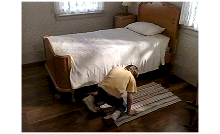 それからかなりの日が経ち、写真魔になった祖父が、3人を撮ろうとするのを、みんながワザと逃げて回るシーンがある。それはそれで、微笑ましいのだが、問題はジャーニーが隠れようとした場所。それは、ミンの部屋だった。すると、そこにブルームが入って来てベッドの下に入って行く。ジャーニーが、ブルームの様子を見ようとベッドの下を覗くと(1枚目の写真)、ブルームは引き裂かれた写真片の入った紙箱の中に、気持ち良さそうに横になっていた(2枚目の写真)。キャットが入って来て、そのあと、祖父と祖母も入ってくる。ジャーニー:「一緒に、持って行かなかった。ここに、残してったんだ」。キャット:「ワザと、みんなに見えるように やったのね。こんなの、殺人と同じよ」。「僕、直してみるよ、キャット」(3枚目の写真)。それを聞いた祖父は、止めようとした祖母に、「やりたいように、させるんだ。あの子には、その権利がある。ジャーニーの過去なんだから」と言う。