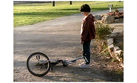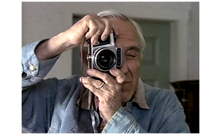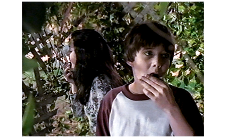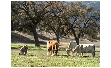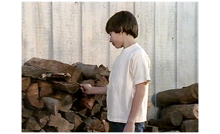 ジャーニーが納屋の脇に積んである薪のところに行くと、農園の下働きをしてくれているブーンというメキシコ人の男が、「お早う、ジャーニー。お祖父ちゃんを捜してるんか?」と訊く。「ううん」(1枚目の写真)。思い直して、「どこにいるの?」と訊く。「牛の糞を撮ってなさる」。ジャーニーが振り向くと、確かに祖父はよく知ってる牛なんかを撮影している(2枚目の写真)。ジャーニーの様子を心配したブーンが、「ママは、どうするつもりかな?」と訊くと、「戻って来るさ」と答えて歩み去り、木の影に隠れるようにして祖父の様子を窺う(3枚目の写真)。