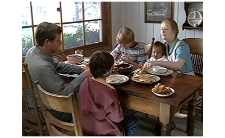 ジャーニーが窓から覗くと、クーパーが乗り捨てていった自転車が横倒しになっている〔ライトが付いていないため、真っ暗で走れなかった?〕。ジャーニーは窓から出ると〔窓の真下に石炭の搬入口の斜路があり、窓から簡単に出入りできる〕、自転車の前に立つ(1枚目の写真)。そして、そのままクーパーの家に向かって自転車を漕ぐが、途中で写真のことが悲しくなり、涙が止まらなくなる。クーパーは、自転車を見て、「届けてくれてありがとう」と言い、ジャーニーは、「カーボーイ・ハットのこと、ごめんね」と謝り、2人のわだかまりは解消する。「泣いてるのか?」。「うん」。「じゃあ、行こう。ミセス・マクドゥーガルが朝食を用意してる」〔この一家は変わっていて、お互い敬称で呼び合っている〕。家に入って行くと、クーパーの父が、「食事は要らない、ミセス・マクドゥーガル。コーヒーを いただくよ」と声をかける。ジャーニーは 一緒に食卓に着くが(2枚目の写真)、エメットは 両親からとても可愛がられている。壁には、額に入ったエメットの写真が一杯飾ってある。それを見るジャーニーの顔は、羨ましそうでもあり、嬉しそうでもある。食事が終わり、ジャーニーがたくさんある家族写真を見ていると、クーパーの両親が寄ってくる。ジャーニーは、「お祖父ちゃんは、『写真は、時には “真実” を示す』って言ってた」と話す(3枚目の写真)〔祖父の発言は、「時には “ありのまま”を見せる事もある」と「わしは “真実” を話してきた」。ジャーニーは、これを混同している〕。クーパーの父:「そうだな、この写真には “真実” がある。どうだい、俺、ニコニコしてるだろ。嫁さんを、射止めたんだもんな」。クーパーの母:「ダンカンが言う通り、この写真には “真実” があるわ。でも、そっちの写真を、見てごらんなさい。如何にも、理想の一家って感じするでしょ?」。しかし、中に、一人意地悪な男が、ニコニコした顔で写っていることを指摘。「時々 “真実” は、写真の陰に隠れてしまい、表(おもて)には 現れないのよ」。