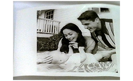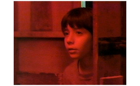 鍵は掛かっていなかったので、ドアを開けると、中は真っ赤だった(1枚目の写真)。祖父は、後ろ姿しか見えないが、白い電球を付けて何かしている。1つ作業を終えた祖父は、気配に気付いて振り返ると ジャーニーがドアの所にいることに気付く。「靴は どうした?」。「これ全部、何なの?」。「ちょっと、黙っててくれ」。そう言うと、祖父は5つ数える(2枚目の写真)。そして、白い電球を消す。「これは、引き伸ばし機。現像用の、赤いライトだ」。「暗室だね? 一人で作ったの?」。「黒白写真… 過去からの映像だ」。子猫が産まれた時に、ジャーニーがタイマーで撮った写真を指すと、「これは、素晴らしい写真だ」と言う。そして、ジャーニーが 「“完璧” じゃないけど…」と言いかけると、その後の「“ほどほど” だ」は、2人で唱和する。「ここに、もっとある」と言って祖父が渡した封筒の中にはネガ・フィルムが入っている。それを現像すると、出てきたのは、失踪した父と、ミンに見守られた赤ん坊時代のジャーニーの映像だった(3枚目の写真)〔このネガがどこにあったのかが、最大の謎。そして、前にも少し書いたが、ネガがあるのなら、なぜ町の写真屋で現像せずに、わざわざ暗室を作ったのだろう?〕。