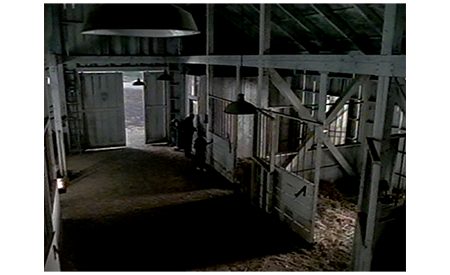 ある夜、ジャーニーがブルームとじゃれていると、2階のミンの部屋で音がして、それから祖父が降りてくる音が聞こえ、開いているドアから顔を見せて、「お休み、ジャーニー」と声をかける。「ママの部屋に いたの?」。「あぁ… 子猫が入り込んどった」。「もう寝るの?」。「いやいや、まだ寝るワケにはいかん。仕事があるからな。お休み」。ジャーニーは祖父が納屋に入って行くのは見たが、そのまま眠ってしまう。そして、なぜか明け方の4時過ぎに目が覚める(1枚目の写真)。窓の外では、納屋の2階の開いた扉から赤い光が見える(2枚目の写真)。一体何だろうと不思議に思ったジャーニーは、納屋の中に入って行き、赤い光が漏れているドアの前まで来る(3枚目の写真)。