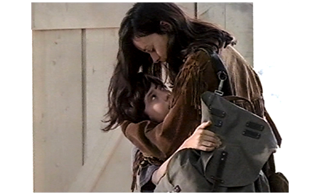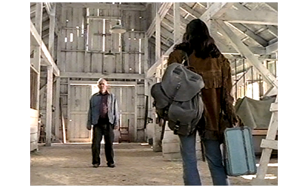 家を出て行く直前、このロクデナシのミンは、それまで貯めてあった写真、自分の写真だけでなく、ジャーニーやキットの写真、2人にとっての思い出のすべてを 1枚残らず細切れになるまで破る。そして、使い古したスーツケースと新品のリュックを持つと、階段を下り、台所で会った祖母には声一つかけず、そのまま家の外に出る。ジャーニーは、キャットに 「そんな… やだよ」と言うなり、後を追いかける。ミンは、車に乗る前、納屋で祖父に向かい合うと(1枚目の写真)、「キャットとジャーニーには お金を送るわ」と言う。それを、扉の端からジャーニーが見ている(2枚目の写真)。マーカス:「ミン、そんな問題じゃないんだ」。ミン:「電話する」。それだけ言うと、納屋から出て行こうとし、ジャーニーとぶつかる。ジャーニーは母に抱き着く。「戻って来るわ、ジャーニー」(3枚目の写真)。マーカスは、ジャーニーに、「いいや、彼女は戻って来ん」と言い、ミンは、嘘を見破られたような目でマーカスを見る。ミンは、そのまま オンボロ車に乗り込み〔一度もフロントビューを映さないので車種不明〕、去って行く。