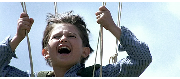 早朝、ピッポはいつものように窓から外に出る。向かった先は厩舎。白い馬にまたがる。馬の体にはロープが一杯結ばれている。そして、ピッポが厩舎を出ると、そこには笑顔のアルフォンシンがいる。だから、この場面は、現実なのか夢なのかよく分からない。少なくとも、老齢のアルフォンシンの納屋に馬はいない。ということは、厩舎から馬を連れて来て、納屋で装備を施したことになる。そして、ベッドで寝たきりだったアルフォンシンが、外に出て、イスに座れるだけ回復する必要がある。ピッポは、ピエールから譲り受けたパラシュートを馬の後ろの木組みにくくりつけている(1枚目の写真、矢印はアルフォンシン)。ピッポは、馬をできるだけ速く走らせる。すると、後ろの台車に乗ったパラシュートが風を受けて空に舞い上がり、それとともに、パラシュートとロープで結ばれたピッポの体も宙に浮く(2枚目の写真、矢印はアルフォンシン)。途中で、アルフォンシンが目を閉じるが、死んだのだろうか? 映画の最後は、ピッポが嬉しさのあまり絶叫したところで(3枚目の写真) 突然終わる。そして、黒地に「セシールとギュスタヴへ」と示される。