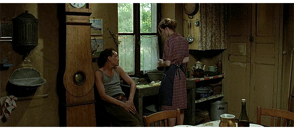ピッポが家に向かって道路を歩いていると、後ろから養父の車がやってくる。それに気付いたピッポは、叱られると思い、立ち止まって道路に背を向ける。車を停めた養父は、「なぜ、こんなことをした?」と訊く。「良くないことだ。心配したぞ」。ピッポは、振り向いたが何も言わない。「乗れ」。次のシーンでは、こんな “悪さ”〔行く先を告げずにいなくなったこと〕 をしたにもかかわらず、養父はピッポを自分の膝の上に座らせて、車のハンドルを握らせている。「どこにいた?」。「池のそばの納屋」(1枚目の写真)。「首吊り男の納屋?」。「それ何?」。「アルフォンシンの旦那が首吊り自殺をしたんだ。それ以来、彼女はちょっと変なんだ」。「正気じゃないの?」。「どっちにしろ、セシールには話すな」。そう言うと、ピッポの髪の毛をかきまわす。ピッポは、悪い気はしない。養父は、家に着く時には運転を交代し、ピッポは助手席から降りる(2枚目の写真)。養母が 「どこにいたの?」と訊くと、「嵐に遭ったので、怖くて避難してた」と無難に返事する。「汚い格好ね。洗うから 着替えなさい」。夕食が終わった後、食卓で養母はトランプの一人遊びをしながら、何かを修理している夫に話しかける。「レネ・シャサン知ってるわよね? 大腸の手術を受けたんですって。癌で、こんなにたくさん切ったの」と、両手で30-40センチくらいの距離を示す。ピッポは、それを見て「すごいや!」と思わず叫ぶが、養母の言葉にはっきり反応したのは、映画の中ではこれが初めて。養父は、子供にとって適切な話題ではないと思ったのか、「寝る時間だぞ」と注意する。ピッポは立ち上がるが、これも、自分から初めて養母に質問する。「セシールさん、アルフォンシンさんはホントに魔女なの?」。「誰がそう言ったの?」。どう答えてもヤバいので、ピッポは肩をすくめて、早々に立ち去る。養母は 「あの態度! あの子、まともだと思う?」と批判。夫は 「やめんか」と、妻の “ピッポ嫌い” を批判する。。