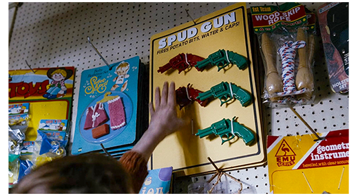 次のシーンでは、2人は、オモチャやお菓子を売っている店にいる。ミッキーボーは、広げた新聞の上から目だけ出してジョンジョを見ている。ジョンジョは、店主の前でカウンターの新聞の上に両手を乗せ、背後の棚を見る〔新聞の見出しは、「都心のバーで5人爆死」〕。そして、「ミゼットジェム〔砂糖菓子〕、お願い」と指差す(1枚目の写真、矢印はミッキーボー)。店主が後ろを向いてミゼットジェムの入ったガラスケースを取っている隙に、ミッキーボーは、自分の前の壁板から、赤と緑のオモチャの拳銃を1個ずつ盗む(2枚目の写真)〔“SPUD GUN” はジャガイモの皮に押し付けて作った “弾丸” を撃ったり、水鉄砲にもなるオモチャ〕。ミッキーボーは2丁をズボンに挟むと店を飛び出し、ジョンジョも後を追う。店主は、何が起きたか分かっていない。