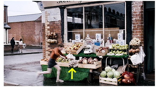 ミッキーボーは青果店の店頭を走り抜けてジャガイモ入りの袋を奪い(1枚目の写真、矢印)、2番手のジョンジョは、食料としてのバナナを奪う。同じ場面ではつまらないので、ジョンジョは、青果店の次に、軍が通行人(?)の持ち物検査をしている前を通り抜ける時の映像(2枚目の写真、矢印はバナナ)にした。ミッキーボーは、煉瓦の壁にもたれてタバコを吸っている。周りにはジャガイモ1個と、バナナの皮が3つ転がっている。そして、「心配するな、相棒、おいらん時も最初はそうやった。すぐに慣るー」と言う。すると、カメラが右に移動し、大きなゴミ缶に向かってゲーゲー吐いているジョンジョが映る。そこにも、ジャガイモの袋と、バナナの皮が3つ。手にタバコを持ったまま顔を上げたジョンジョは、「バナナは、もうよかや」と言う(3枚目の写真、矢印はジャガイモとバナナ)〔タバコのことを言わないのは、負けたくないから〕〔右側のジャガイモの表面の点の幾つかは、SPUD GUNを突っ込んだ痕〕。