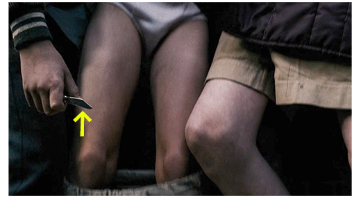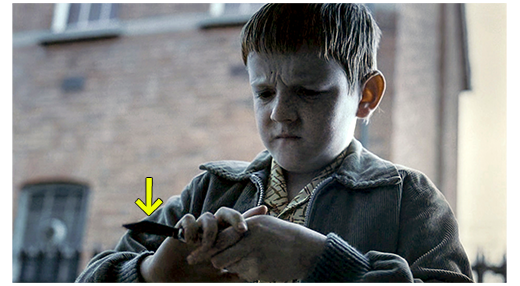 映画を観終わった後、映画館の階段を降りながら、ミッキーボーは、「ブッチが デカいキモ野郎んタマば蹴り上げたっちゃろ。あれ良かったな〔That was class〕」と言った後で、「おいらはブッチ、お前はサンダンスや」と言い出す(1枚目の写真)。「なんで?」。「おいらがそう決めたけんしゃ」。「サンダンスなんか嫌や。ブッチん方がよか」(2枚目の写真)。「なに考えとーったい。おいらはブッチや。お前はサンダンス。こんギャングば始めたんな、おいら。やけん〔だから〕、おいらがボスや。お前がブッチん馬になりたきゃ、ばってんよか〔それでもいい〕。馬か、サンダンスのどっちだ?」。「そげん風に言うんやったら、サンダンスでよか」。「じゃあ、一発始めようじぇ、相棒」〔ミッキーボーは何様のつもりで、片やジョンジョは何故こんな年下の不良に唯々諾々と従っているのだろう?〕。ところが、映画館から出た途端、2人はGankとFartfaceに捕まる。Fartfaceはジョンジョに、「お前、どっから来た?」と訊く。ジョンジョが 橋の向こうと答えたものだから、Fartfaceは ジョンジョの左手を掴むと、薬指と小指と間にナイフを入れ、「俺たちは、あっち側ん奴らは好かんのや」と言い(3枚目の写真、矢印はナイフ)、刃を押し付けるので血が出てくる。「もし、今度、ミッキーと一緒にこん辺ばうろついとったら、まっすぐしょんべんができんごと〔できないように〕してやる。分かったな?」と言うと、一気にナイフを引き、指の間が切れる。薄暗くなってから帰宅したジョンジョを、母はひどく心配する。しかし、「どこにいたの?」と訊かれても、ジョンジョは 「外」と答えるだけで、手の傷のことはひた隠しにする。そのあと、ベッドで横になったジョンジョに、母は 「あんたがここしゃぃ〔ここに〕おらんと心配と。家んそばにおるんばい」と言い聞かせる(4枚目の写真)。「よかばい」。その時、遠くで爆発音が聞こえる。「どこやろう?」。「大丈夫。橋ん向こうやけん」。ジョンジョが窓から覗くと、ミッキーボーと一緒にいた方角が赤く染まっている。「Palestine St.ん人たち、大丈夫やろか?」。「誰か、知っとーと?」。独白:「煙が上がるんば見よーと、心が折れそうになった。ばってん〔でも〕、母しゃんにミッキーボーんことば話すことはできんかった。心配ばかくる〔心配をかける〕だけやけん」。