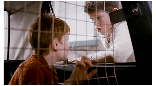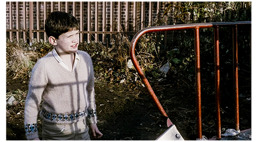 安全な所まで逃げた2人。ミッキーボーは、自分より格段に速く走れるジョンジョに、「いったいどうやったんや?」と訊く(1枚目の写真)。「何が?」。「おいら、学校中で一番早か。誰にも負けたことがなか」〔彼の言うことは嘘ばかりなので、この言葉も怪しい〕。「君が逃げれて〔逃げろと〕言うたけん、走ったんや」。「どこから来た?」。「すぐそこだ。君は?」。「橋ん向こう側や」〔ジョンジョは、相手がカトリックだと分かる〕。その後、近くの遊具まで行った2人。ミッキーボーは、「お前、仲間いるんか?」と訊く。ジョンジョは首を横に振る。「おいらとお前で、GankとFartfaceばやっつけようじぇ」〔GankとFartfaceは映画の最初にミッキーボーを追いかけていた2人の不良だが、gankは “かっぱらう” という意味の動詞、fartfaceは “いけ好かない” という意味の名詞〕「あいつらんタマば蹴り上げて、おいらん〔おいらの〕自転車ば取り返すったい」(2枚目の写真)〔自転車云々は嘘〕。「誰って?」。「おいらん通りにおる奴らで、いつも追いかけまわしゃれとー〔まわされてる〕。おいらん新品ん自転車ば盗みやがったけん、ボールば盗ってやった」(3枚目の写真)〔自転車云々は嘘。ボールを盗んだことは事実だが、なぜか、もう持っていない〕。ミッキーボーは、遊具から降りると、盗みに慣れているので、ジョンジョのお尻のポケットに入っていた雑誌を許可なく取ると、「貸しぇやな、後で返す」と言って持って行く。「いつ?」。「昼飯ん後。Palestine St.で。親父んぱげた〔親爺の壊れた〕バンがあるウチや」。