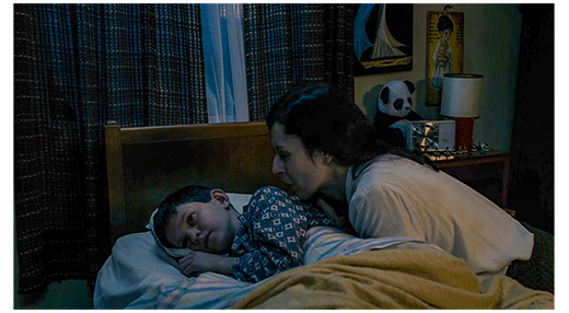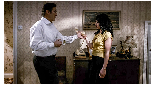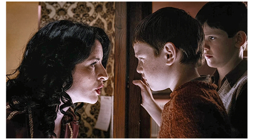 ジョンジョは、そのまま父の家に連れて行かれる。冷酷な父親は、ドアを閉めると、抱き締めるどころか、「お帰り」や「大丈夫やったか」の一言もなく、いきなり 「弁明せれ」と命じる。「ミッキーボーと僕は…」。「あいつんことなどどうだってよか。お前は何ばしでかしたんや?」。その時、玄関の開く音が聞こえる。階段に座らされていたジョンジョは、母が来たと思い 「母しゃん!」と言ってドアを開けると、そこにいたのは映画館の女性。「まあ、誰かて思えば、ちっちゃな放蕩息子やなかと」。ジョンジョは、「彼女、ここで何しよーと?」と父に厳しく訊く(1枚目の写真)。「父しゃんのお友だちだ」。「ソーシャルワーカーみたいなものね、坊や」。「僕、あんたん子なんかやなか。どげん人か知っとー。映画館で見たっちゃん〔見たよ〕、シドニーとボボしとったやなかか〔セックスしてたじゃないか〕。ベルファスト中ん男と寝るつもりと? それも妻子んあるごたー〔あるような〕?」。父は。「ジョンジョ!」と制するが、それに構うことなく、ジョンジョは さらに口撃を続ける。「僕はあんたん子やなかし、あんたは僕ん母しゃんやなか。あんたは売女(ばいた) や。出てけよクソッタレ」。父は、ジョンジョを掴むと、「もう十分や!」と怒鳴る。女性は、「ましゃか、ここまで言わるーとはね」と言うと、玄関の鍵を棚に置き、ドアをバタンと閉めて出て行く〔恐らく、二度と戻って来ないだろう〕。父は、ジョンジョに 「お前ん部屋に行くったい。朝になったら話し合おう」と言うが、ジョンジョは 「父しゃんが言うたごと、僕ん部屋〔伯母の家の〕に行く。母しゃんと僕は、ここしゃぃは〔ここには〕もう住まん」と宣言すると(2枚目の写真)、家を出て行く〔これで、この愚かな父は、妻と愛人、プラス、息子の3人を失った〕。リタ伯母さんの家に行ったジョンジョは、母の胸にしっかりと抱かれる(3枚目の写真)。