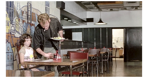 バンは、森の中で夕食のために停まっていただけで、2人を乗せて走り始める。場面は、コンスタンチンが、「シルヴィアが突然、行っちゃったんだ」と話す場面から始まる(1枚目の写真)。「シルヴィアって? 誰なんだ」。「僕らの母さん」。リアは、「ホントの母さんじゃない」と補足する。「いつだ?」。リア:「今日の午後」。次のシーンでは、もう朝になっている。2人は、モーテルのベッドで一緒に寝ている(2枚目の写真)。皿のガチャガチャいう音で、最初に目が覚めたのはリア。弟は寝かせておき、反対側からベッドを出て、サンダルを履き、窓から外を見ると、「コンスティ〔コンスタンチンの略称〕」と呼ぶ。「起きて」。弟は、目を覚ますとベッドの上で体を起こす。「靴を履いて」。コンスタンチンは、靴を履くと紐を結び始めるが、どうせうまくいかないと思った姉が、代わりに結んでやる(3枚目の写真)〔ここだけは、姉らしい〕。2人は、ドアの並ぶモーテルの廊下を歩き、リアが扉を開けると、食堂の一角で上半身裸になった老人が、シャンプーケープだけ掛け、年配の女性が髪を切り揃えている〔経営者の夫婦?〕。2人が屋上に行くと、そこには、「restauracja(レストラン)」という文字看板の字が逆さまに映るので、レストラン付きモーテルだと分かる。