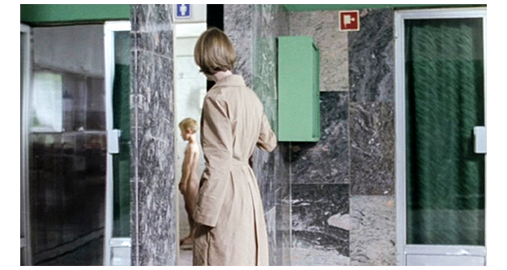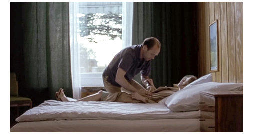 ところが、そのサービスエリアのレストランには、午後6時まで時間を潰すため、2人の父とシルヴィアが入っていた。夫は何も言わずに、横を通っていったウェイトレスの動きをじっと見ている。すると、彼女が厨房に入ろうとした時、出てきたボーイと接触し、肩に近い高さで運んでいたトレイが床に落ちて 皿の割れる音が響く。それを見たシルヴィアが初めて笑顔になり、声を出さずに笑う。夫も、つられて笑い出す。子供と再会できた訳でもないのに、こうした状況が結構長く続くが、非常に不気味な雰囲気だ。すると、急にシルヴィアが立ち上がり、身を乗り出して夫に熱烈なキスをする〔これは、先に引用したEDGEによれば、夫が後妻に求めたのは肉体的快楽だけで、シルヴィアもそれを承知で、前妻の子供のことなんか100%どうでも良かったと書かれている。そういう意味では、行方不明の責任の一端は 夫にもあるのだと〕。長いキスの後、2人は見合う〔これは、お互いの立場を再認識した姿だとか〕。シルヴィアは、「すぐ戻るわ」と言い、席を立つ。そして、レストランを出てトイレに向かうと、「冷たいよ」という声が聞こえる。シルヴィアはそっと覗くと、トイレの中では、全裸にされたコンスタンチンが、冷水を掛けられ、タオルで擦られて汚れた体を拭かれている(2枚目の写真)〔“商品” を完璧な姿で持ち主に届けるためにきれいにしただけ〕。その光景にショックを受けて隠れたシルヴィアの脇を、大人のセーターを羽織ったコンスタンチンがクバと一緒に外に出て行く。シルヴィアは、夫に知らせることもせず、建物から外に出ると、自分のした “置き去り” の結果を直接目にしてようやく自分の非人間性を反省したのか、アスファルト上に崩れるように倒れる(3枚目の写真)。