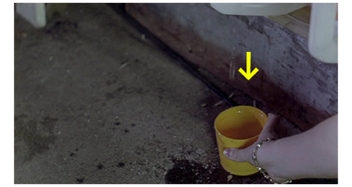バンは、約束の場所に向かって走っている。リアは、隣に背を向けて横になっている弟に、「コンスティ。あいつ、私たちを家になんか連れてかない。ここから出ないと」と、間違った情報を伝えようとする。しかし、コンスティは全く反応しない。リアは、「あんた変よ。なぜ、何も言わないの?」と訊き(1枚目の写真)、再度、名前を呼ぶが、それでも、反応はゼロ〔昨夜のレイプがショックだった〕。しばらくして、リアは、トイレの消毒薬の瓶から、液体が漏れているのに気付く。リアは、運転席の真後ろに置いてあったクバの水筒をこっそり取ってくると、黄色のフタを外し、それを漏れている液体の下に置く(2枚目の写真、矢印は液体の落下方向)。バンがかなり走り、ある程度液体が溜まると、リアは、それを水筒の中に流し込む(3枚目の写真、矢印)。そして、元あった場所に戻す。