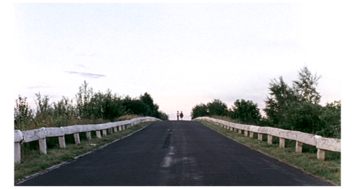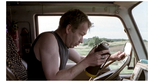 サービスエリアに向かって疾走するバンの中で、喉が渇いたクバは、右手を回して水筒をつかみ取ると、フタを外し、水筒を傾けて口に流し込む。しかし、飲み込んだ瞬間、中身に気付き(1枚目の写真)、水筒を放り出すと、急ブレーキをかける。そして、車が停まると、すぐ外に出て、飲んだものを吐き出す(2枚目の写真、矢印)。気を静めると、バックドアを開け、最後尾に積んであったポリタンクから水をゴクゴクと飲む。一連の動作が終わると、バンの中の “ポタポタと漏れている消毒薬” を触ってみて、すべてリアの悪だくみだと気付く。クバはリアを睨みつけ、“1万ユーロより、このガキを懲らしめたい” と心に決めると、「出ろ!」と命じる。リアが降ろされるのは当然だが、ここでも、最初の “置き去り” と同様、コンスタンチンも犠牲になる。2人とも、裸足のまま車から降りる(3枚目の写真)。「失せろ」。2人は、車が向かおうとしていた方向に向かって、歩き始める。このラストシーンは、2人が道のてっぺんに着き(4枚目の写真)、さらに姿が完全に消えるまで、固定されたカメラで2分30秒にわたって映し続けられる。2人は、この先、どうなるのだろう? 歩いている方向は、ドイツに近い最後のサービスエリアで、そこには父が待っている。もし、1本道がサービスエリアに通じていて、父が我慢強く待っていれば会えるかもしれない。会えなくても、国境まで歩いていけば、係官がドイツ側に連絡し、警察が迎えに来るに違いない。