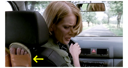 国境を越えてから5キロほど走ったところで、リアが、「遠くまで行かないって言ったじゃない」と文句を言い出す。シルヴィアは、「そんなに遠くない」と答える。それに不満を抱いたリアは、サンダルを履いた両足を運転席に押し付け、ドンドンと叩く〔運転席が揺れる〕。シルヴィアは 「今すぐ止めなさい!」と叱る(1枚目の写真、矢印はサンダル)。リアは、生意気に「今すぐ止めなさい」と、同じ言葉をシルヴィアにぶつける。シルヴィア:「止めなさい!」。リア:「止めなさい」。「大抵になさい!」。「大抵になさい」。「バカげてる!」。「バカげてる」。このバカげたくり返しに、シルヴィアは黙るしかない。すると、リアが、「おしっこに行く」と言い出す。「緊急よ、でないとパンツが濡れちゃう」。シルヴィアは、車を停め、「出なさい」と言う。しかし。リアは降りようとしない。すると、シルヴィアは、「2人とも降りて!」と命じる。2人が降りると、「ドアを閉めて!」(2枚目の写真)。リアがドアを閉めると、シルヴィアは車を勢いよく出す。リアが、「シルビア!」と叫ぶが、無視して走り去る(3枚目の写真)。リアが悪い子であることは確かなので、仕方がないといえば仕方がないが、コンスタンチンこそ、いいはた迷惑だ。シルヴィアの行為が非常識なことは言うまでもない。