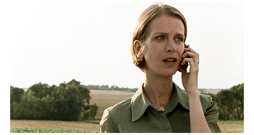 先ほど置き去りにした場所は野原だったが、両側に森が広がっている所まで来たシルヴィアは、脇道に入って車を停める。そして、車から降りると、さっきまで吸っていたタバコを、そのまま吸い続ける(1枚目の写真)。この非道な女性が何を考えているかは分からない。ただ、後で映る夫の対応と比較すると、実の娘と息子に対する強い愛情と、継子に対する嫌悪感に近い無情との差が、明らかだ。しばらくして、シルヴィアは、もと来た道を戻り、継子を置き去りにした場所まで戻るが(2枚目の写真)、2人はどこにもいない。「リア! コンスタンチン! 出てらっしゃい。行くわよ!」と呼ぶが、返事はない。3度呼んだところで、車に置いておいた携帯に着信がある。シルヴィアは、車まで戻って電話に出る。それは 夫からだった。シルヴィアは、夫から何か訊かれたことに対し、「いいえ、何も問題ないわ。(1人で)買い物に来てるの」と、嘘を付く(3枚目の写真)。