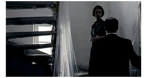 シルヴィアは、何のつもりか全く分からないが、そのページを破り取り、小さく折り畳んで封筒に入れて密封する。その時、玄関が開き、夫が入って来たので、封筒を急いで服の中に隠す(1枚目の写真)。夫の第一声は、「電話あったか?」。「いいえ」。「すぐに、2人の警官を送ってくれるそうだ」。それを聞いてもシルヴィアは何も言わず、夫が紙に何か書いているのに、キッチンの照明を消し、2階への階段に向かう。「どこに行くんだ?」。「服を替えようかと」。そう言うと、これから上がって行くのに、階段の照明も消す。夫は、妻の背中に向かって、「待てよ、今日、子供たちは何か言ってたか?」と訊く。「いいえ」(2枚目の写真)。足を止めてそれだけ言うと、そそくさと階段を上がって行く〔異常としか言いようがない〕。夫は、「ケンカしてなかったか?」と訊くが、返事もしない。呆れた夫は、階段を駆け上がる。シルヴィアは、寝室の自分の枕の下に、さっきの封筒を素早く隠すと、窓の方を向く〔夫に背を向ける〕。夫は、寝室の照明を点ける。シルヴィアは、急に振り返ると、「いいえ、すべて正常だったわ」と、ようやく返事をする。夫:「グレルマン先生が電話を掛けて来た時、君はどこにいた?」。「買い物よ」。そう言うと、また夫に背を向ける。「だが、留守録は聞かなかったのか?」。「留守録は、あなたのためでしょ」。その、あまりにもそっけない態度に、夫は、「子供たちが行方不明になってるのに、君は、何事もなかったように振る舞ってる。君は私の妻で、2人は、君の子供たちなんだぞ」と非難する(3枚目の写真)〔シルヴィアの冷酷さがよく分かるシーン〕。