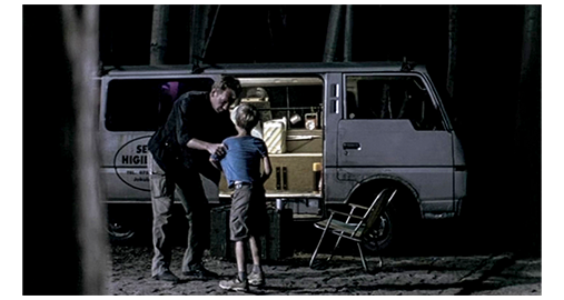 森の中で辺りは真っ暗になり、お腹も空いてきた。1台のバンがドアを開けて停まっている。誰もいる様子がない。そこで、リアは、「あんた、食べ物を手に入れてきなさいよ」と弟に命じる。「きっと、誰かいるよ」〔ドアが開けっ放しで、照明も点いているので、いないハズがない〕。「いないわよ」。「もし、いたら」(1枚目の写真)。「決めるのは私。だから、行きなさい」〔ひどい姉だ〕。コンスタンチンは、仕方なく車に近づいて行き、外に出してあった木のテーブルの上に置いてあった食べ物をズボンのポケットに入れる。すると、バンの後部から男〔名前はクバ〕が現れたので、卑怯なリアは、すぐに木の陰に隠れる。コンスタンチンは、気付かずに、盗みを続ける。クバは、いきなり、ポーランド語で話しかける。コンスタンチンは逃げるが すぐに捕まり、「放して。助けて、リア!」と叫ぶ。「ドイツ人か? じっとして。怖いのか?」(2枚目の写真)。そう言うと、クバは、「全部、テーブルの上に戻すんだ」と言い、コンスタンチンはポケットから盗んだものを取り出して置く。クバは、お腹が空いての盗みと分かり、横に置いてあったイスに座るよう命じる。クバは、バンに腰を降ろすと、コンスタンチンが盗んだ食パンに、盗まなかった何かを載せて、“ほら食べろ” と言わんばかりに、コンスタンチンに差し出す(3枚目の写真)。コンスタンチンは、すぐ受け取って食べ始める。そして、さっき、「助けて、リア」と叫んだことから、もう1人いると分かっているので、「怖がらずに、出て来い。食い物があるぞ」と呼びかける。それでも、姿を見せないので〔どっちが、「この弱虫。いつもビクビクしてる」なんだろう?〕、クバは、隠れている子供の名前をコンスタンチンに訊き、「リア、来いよ。仲間は、もう食べてるぞ。数分で、食い物がなくなるぞ」と言う。