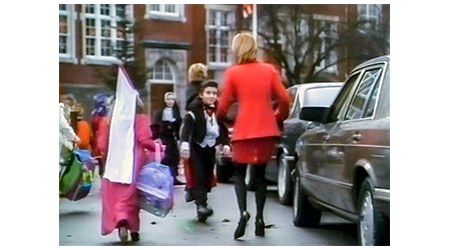 映画の冒頭、題名にかぶるように一軒の豪邸が映る。VHSからまともな映像が取り出せなかったので、映画のロケに使われた家をWEB上で探したのが1枚目の写真。映画はアメリカのTV映画だが、撮影はカナダ西海岸のバンクーバーで行われたとの情報をもとに、“新古典主義”、“豪邸” と掛け合わせて出てきたのが、映画で使われた建物。1914年に建てられたバンクーバー屈指の豪邸で、ダウンタウンの南南西約3キロの “The Crescent” という楕円形街区の1388番地。グーグル・ストリートビューでは、門しか見えない。オープニング・クレジットの間、この豪邸に住むサラという30代半ばの美しい女性が、30年前の “受話器のような形” の携帯電話で話している。電話の間じゅう、10歳の息子のサムが、「ママ、どこ?!」と叫んでいる。電話を早々に終え、グランドピアノの置いてある部屋に降りて行くと、サムがドラキュラの出で立ちでピアノを弾いている〔ということは、この日は10月31日のハロウィーン〕。母は、隣に座ると、弾き終わったサムに、初心者の演奏にもかかわらず 「ブラボー!」と拍手する(2枚目の写真)。「ママも弾く?」。2人で弾き始めると、母は抜群に巧い〔サムは左手だけで伴奏〕。「じゃあ、学校に行きましょ」。母は、メルセデスのSクラス(W126)で、小学校までサムを送る(3枚目の写真)。その他の生徒も何らかの仮装をしている。そこで会った他の生徒の母親(友人)に、「シャネルなんか着て、朝食デート?」と訊かれると、サラは、「弁護士に会いに。やっと終わるわ。明日、正式に独身女性になるの〔離婚が成立〕」と答える。