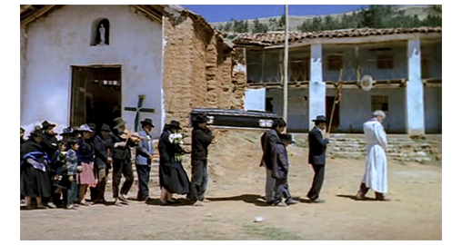 翌日、墓地に向かって、神父を先頭に、村長の遺体の入った棺、そして、村人全員が その後に続く(1枚目の写真)〔棺の右前方を担いでいるのは、村長の長男、その右がパチョ〕。集落を離れて崖の横にさしかかると、上から紙吹雪が降って来る(2枚目の写真)。フアンの母が拾って読むと(3枚目の写真、赤の矢印はセンデロ・ルミノソ(毛派共産党)が関与した場合)、そこには、「裏切り者は こうやって死ぬ。人民戦争万歳!」と印刷してあった。