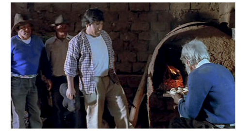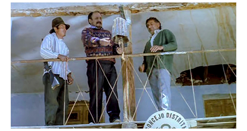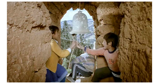 こうして 出来上がった鐘は、映画の中に出て来るもので4個。最初に映るのは、村役場の2階に、村長自らが吊るす。2個目は、歩道沿いの大きな岩に金属棒を打ち込み、そこに鐘が掛けられる(2枚目の写真)。3個目は、どこかの家の前に木の柱が立てられ、そこから鐘が吊り下げられる。4個目は、ロジータの家の下の歩道沿いの大きな木に打ち付けた太い枝から吊り下げられる。鐘の下の3人は フアンとパチョとロジータ(3枚目の写真)。次のシーンでは、まず村長が鐘を鳴らし、他の3つも同時に鳴らす。そうすると、狭い村中で鐘の音が鳴り響き、もしテロリストがやって来たら、素早く、確実に、全員に知らせることが可能となる。