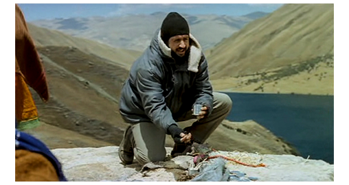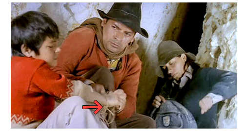 フアンは、手近な隠れ場所に連れ込まれ、両手を縛られる(1枚目の写真、矢印)。そして、そこからは、縛った両手にロープをつなぎ、男のテロリストが引っ張りながら連行する(2枚目の写真、矢印はロープ)。途中、いろいろな風景が短く映るが、びっくりしたのは、氷河の末端の氷河湖に沿って歩く部分(3枚目の写真、写真では見えないが フアンはまだロープでつながれている)。