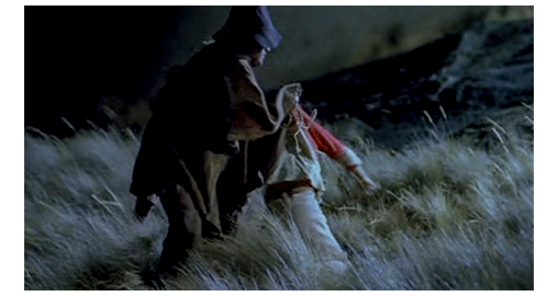 その直後の一緒の映像で、テロリストの1人が物見の塔の村人を襲う。これで、警報が出せなくなった。一方、パチョは、兄に会うと、フアンを助けようと、「僕、フアンを見た。丘へ行ったよ」と嘘を付く。「偉いぞ。いつだ?」。「ほんの少し前」。「みんな来い。丘に行くぞ! 急げ!」。これで、村から警護団がいなくなる。フアンは、家に向かい、フェルミンが、酔っ払ってよろよろと家を出て行ったのを見届けると、ドアを開け、「母ちゃん」と声を掛ける。その声で、母はフアンに駆け寄り、固く抱きしめる。「フアン あんなことになって… 私には どうすることもできなかったの」と謝る(1枚目の写真)〔この言葉は、母が “フアンは、フェルミンの告げ口で センデロ・ルミノソに拉致された” ことを知っていたことを間接的に示しており、母がテロ組織の補助員だと最初に示す証拠でもある〕。フアンは、「母ちゃん、彼らが来るよ。奴らに、母ちゃんは殺させない。逃げないと」と必死に言う〔かつて、人非人のカルメンが、「シリロ、あんたが逃げても、あんたは殺さない。あんたのお母さんを殺す」と言ったから〕。しかし、愚かな母は、「フェルミンを待たないと。一緒に行くのよ」と言う〔2人とも、組織の補助員なので〕。「あいつらには慈悲がない」。「もうやめて、フアン」〔自分の組織のメンバーなので、こう遮る〕。「ぼくも殺したんだ」〔伍長を刺したのはフアンでなくカルメンだが、検問所に爆薬を持って行ったのはフアン〕。「お聞き。あなたは まだ幼い。誰も殺してないわ」。「ぼく、やりたくなかった」。「フアン、やってないわ」(2枚目の写真)〔フアンを擁護しているのではなく、テロに加担した自分の行動を擁護していると思えなくもない〕。一方、酔っ払って村の方に歩いていったフェルミンは、ウィルメらの中核部隊と出会う。フェルミンは、「ゴンサロ大統領万歳。抑圧者に死を」と言うが、ウィルメの側近に、「飲んでるな!」と、帽子を跳ね飛ばされる。フェルミン:「あなたが来られると、祝ってました」。ウィルメは銃を突き付け、「お前はサンブラーノを殺した」と糾弾する(3枚目の写真、矢印)。フェルミン:「殺したのは陸軍です。奴らは 道路で彼を捕まえました」。フェルミンが、同志殺しの犯人ではないと分かったものの、党員が酔っ払っていることを問題視したウィルメは、フェルミンを無里矢理同行させる。