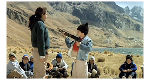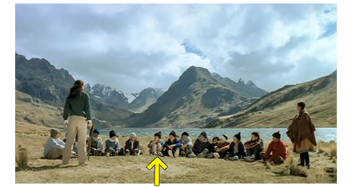 フアンが、湖畔で1人座っていると、そこにウィルメがやってきて隣に座る(1枚目の写真)。最初に行った言葉は、「なぜ逃げようとした? お母さんのところに戻りたかったのか? 君の家は村にはない。ここが君の家だ。我々が一緒にいるのは、何か良いこと〔殺戮〕をするためだ。我々は新しい人生〔国家の破壊〕を築いている。君のお母さんは家で元気、君はここで元気だ。ここに お母さんはいない。ここには、我々、君の友人、君の同志がいる」という長口上。フアンが何も言わないので、ウィルメは石を拾い、「この石を、跳ね返らせられるか?」と訊く。それでも、反応がないので、立ち上がると、岸辺まで行き、石を投げて3回以上跳ねさせる。そして、もう1つ石を拾い、「試せよ。失敗しても、何も起きん」と言って石を渡す。フアンは、2回跳ねさせる(2枚目の写真、矢印は1回目)。この映画の大自然はとても荒涼として、それでいて、美しい。この湖だけ、場所を突き止めることができた(3枚目の写真、グーグル・ストリートビューの固定地点)。アンカシュ(Ancash)県の県都ワラス(Huaraz)の南東約30キロにあるケロコチャ湖(Laguna Querococha)だ。ここからの会話が、如何にも、“子供だまし” なので面白い。「君は、何になりたい?」。「鍛冶屋」。「金を稼いだら、飢えた人々をどうする? 放っておくか?」。「ううん」。「どうする?」。「お金を少しと、パンを1個あげる」。「悪くはないが、正しい途は、タダで仕事をすることだ」。「タダで?」。「タダだ」。「誰もがタダで働けば、我々はすべてを手に入れられる」〔絶対に実現しない理想論〕。「クラッカーを買いたくても、お金がない時は?」。「問題ない。お金を払う必要がないから」。「クラッカーがタダに?」。「それが我々の目標で、そのために戦ってる。だからこそ、我々は反動的政府、中産階級、権力者、半封建制度〔1920年代の中国の停滞した経済状態を指す用語~ペルーとは無関係~現実を理解していないアビマエル・グスマンの教条主義的な言葉を意味も知らずに話しているだけ〕と戦うのだ。世の中が良くなることを望むが、そうでない輩もいる。だから、我々は そいつらと戦う」。ここで、フアンは反論する。「でも、パチョの父さんは いい人だった」(4枚目の写真)。「パチョの父親は誰かな?」。「村長」。「村長は 変化を望まん。そして、変わらん者は、人民の銃弾によって死ぬ〔何と、勝手で残虐な理屈〕。パチョの父親は クラッカーがタダになることを望まなかっただろ?」。このような愚かな理論も、子供なら信じてしまう。こうして、このテロ組織は、集めた子供を洗脳していく〔こうした状況を、映画で克明に描くのは、前例がほとんどないので、非常に迫力がある。だから、省略せずに全訳で紹介した〕。