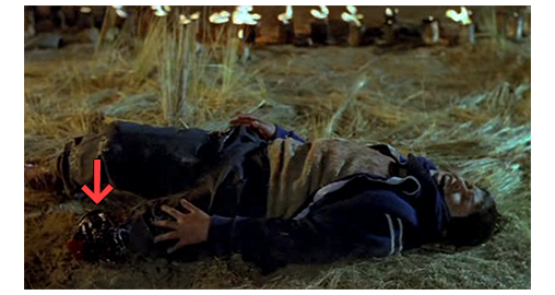 悲鳴を交えたうめき声が聞こえたので、2人は急いで他の連中のところに戻る。悲痛な声をあげ続けているモデストが、オスマンの背中に担がれてやってきて、地面に横たえられる。モデストは、「足が… 足が!」と叫ぶ(1枚目の写真、矢印は吹っ飛んだ左足の膝下部)。モデストは、オスマンに、「僕は泣かないよ、同志! 泣かない!」と、歯を食いしばる。飛んできたウィルメが、「どうした?!」と訊く。オスマンは、「塔に地雷が。誰も分からなかった。地雷が爆発し、同志モデストは吹っ飛んだ」と答える。モデストは、ウィルメにも、「僕は泣かないよ、同志! 泣かない!」と言うが、そのあとで、「僕は かたわになりたくない、同志」と言い、「僕を撃って! 革命の名のもとに 僕を撃って。撃ってよ」と頼む。ウィルメは拳銃を取り出すと(2枚目の写真、矢印)、モデストを容赦なく射殺する。あまりのことに、フアンだけなく、イェニーも顔を背ける(3枚目の写真)〔ここも、とても残酷なシーン〕。基地に戻ったフアンは、モデストが生き返って鳩にならないかと、紙の鳩を折る(4枚目の写真、矢印)。