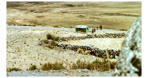 恐らく別の日、村で新築する家の土台部分の工事の指揮を 村長であるパチョの父が取っている。四角い家の土台の中で、足で泥をこねているパチョと、もう一人には、「ちゃんと混ぜろ。ちゃんとやるんだ」と声をかける。丸い石を泥で隙間を詰めて積み、その上に、泥で作った日干しレンガの第1層を並べている男には、「そこ下がってるぞ。ちゃんと平らにせんか」と注意。因みに、このようなアンデス山地の家は
