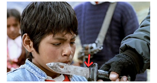 検問所の残骸に攻め入ったウィルメたちは、ケガをした伍長以外はすべて殺し、「お前たちは、昨日俺たちの血を流した。今度は、俺たちの番だ」と宣告する。そして、ウィルメは残酷なことに、「同志シリロ」と呼ぶ。フアンは、後ろに下がろうとするが、イェニーに押し出される。ウィルメは、「これで、君は、人民の真の息子になれる」と言うと、フアンが背中に掛けていた銃を外し、代わりにナイフを取り出し、伍長を「殺せ」と言う。フアンが身動き一つしないと、ウィルメは、フアンの顔の前にナイフを出し、「さあシリロ、殺せ」と、再度命令する(2枚目の写真。矢印)〔この先は 映画の中で、最も汚らわしいシーン。毛派共産党の輩は獣(けだもの)以外の何物でもない〕。フアンは、嫌々ナイフを手に取るが、泣いている伍長を、泣きそうな顔で見上げるのみ。伍長は、「お願い、殺さないで」と、かすれた声で頼む。ウィルメは、フアンに顔を近づけ、「奴らはモデスト殺した〔地雷を仕掛けたから?〕、シリロ。今度は俺たちの番だ。殺せ。殺せ」と催促する。フアンは、一応、刃先を伍長に向けるが、それ以上のことはできない。それに手を出したのが、ウィルメ以上に残虐で慈悲心のかけらもないカルメン。フアンの手をつかむと、伍長の腹にナイフを深々と突き刺し、2人の手が血まみれになる(3枚目の写真、矢印は最悪の獣(けだもの)女の腕)。